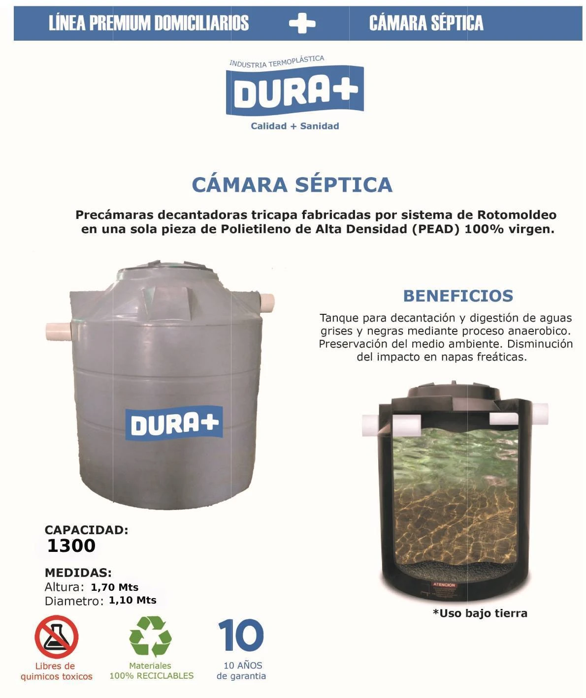 Cámara Séptica de 1300 Litros. Precamara decantadora Construida en polietileno de Alta densidad por sistema de rotomoldeo y garantía de 10 años. Somos Fábrica directo de cámara séptica. Los beneficios de este tanque de decantacion es para el tratamiento de aguas grises y negras . Su función es la preservación del medio ambiente disminuyendo el impacto en las napas freáticas.